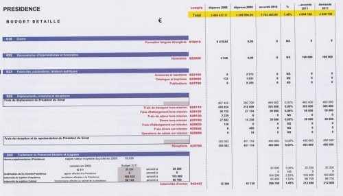 Intitulé «Budget du Sénat pour 2011 - Présentation détaillée par service», il a été bouclé fin 2010. Les chiffres 2008, 2009 et 2010 sont systématiquement rappelés, ce qui permet de juger l'action de Gérard Larcher (élu fin 2008 à la Présidence). S'il n'est pas impossible que certains montants programmés pour 2011 aient bougé à la dernière seconde, c'est forcément marginal. Mediapart a choisi de zoomer sur des données significatives et jamais publiées, quitte à en laisser d'autres de côté (nous y revenons en Boîte noire).